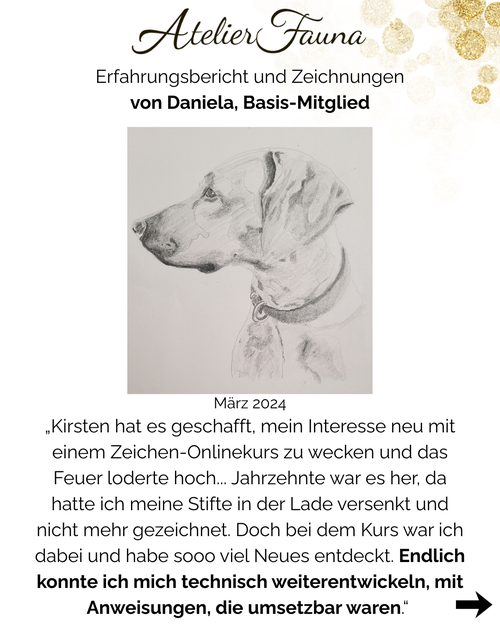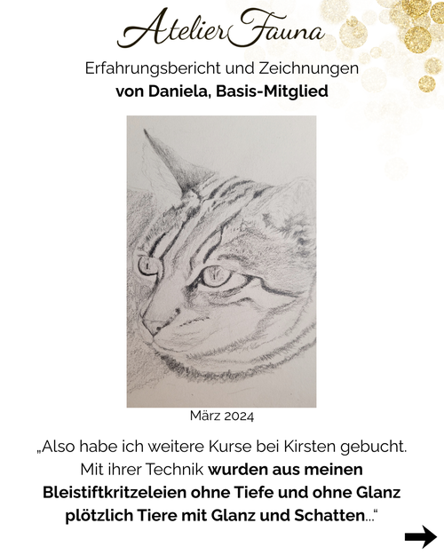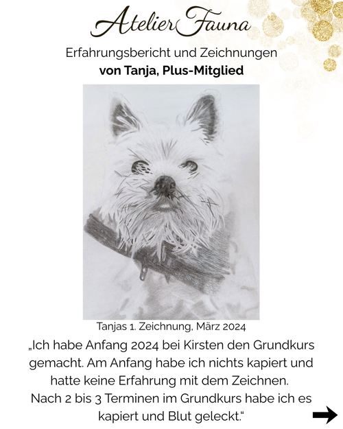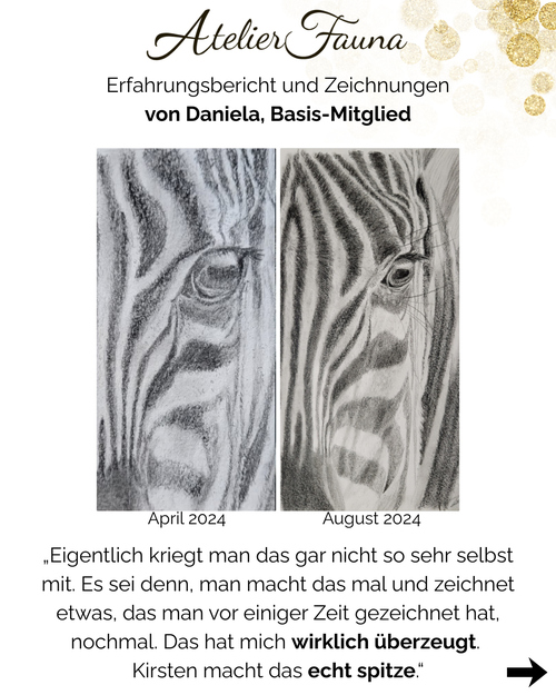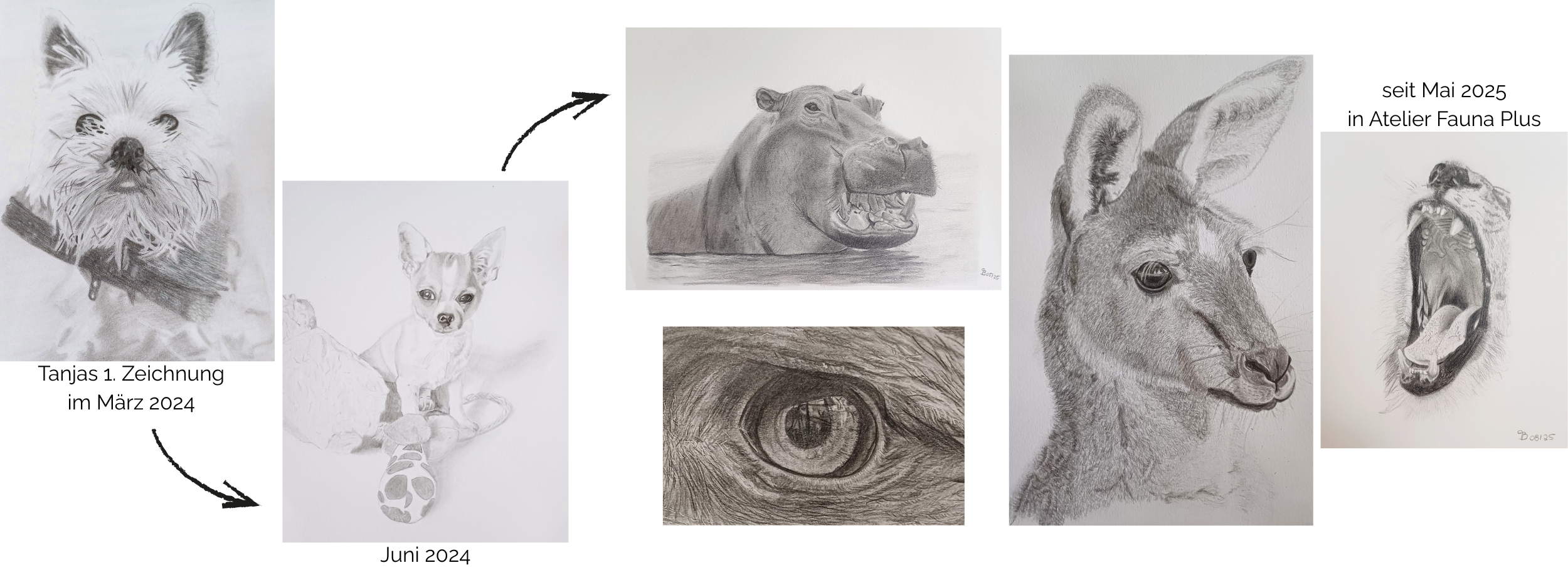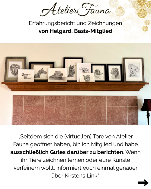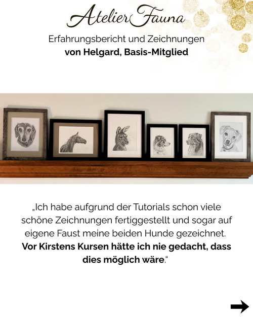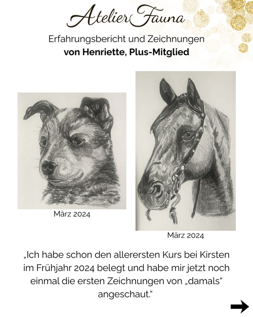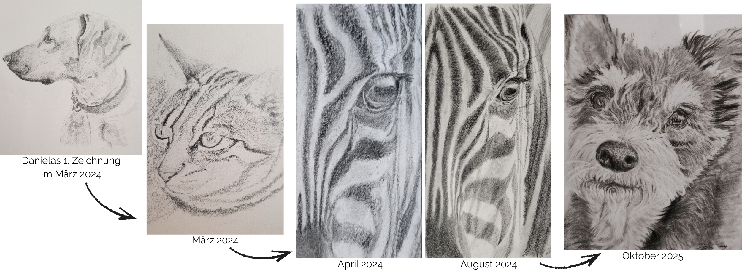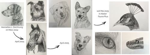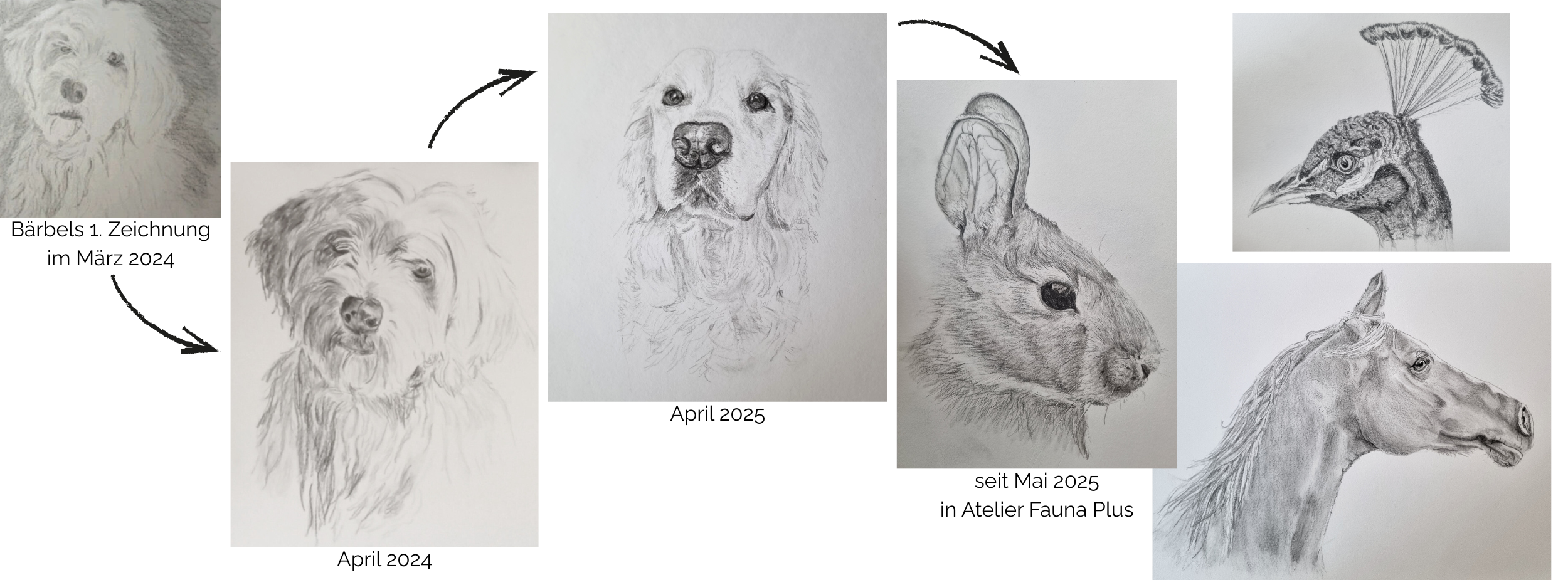 Ich habe schon den allerersten Kurs bei Kirsten im Frühjahr 2024 belegt und habe mir jetzt noch einmal die ersten Zeichnungen von „damals“ angeschaut: War ich damals schon begeistert von meinen Zeichnungen, so sind es inzwischen lebensechte Tierportraits geworden – eine Verbesserung, die ich, wenngleich erhofft, in der Kürze der Zeit jedoch nicht für möglich gehalten hätte.