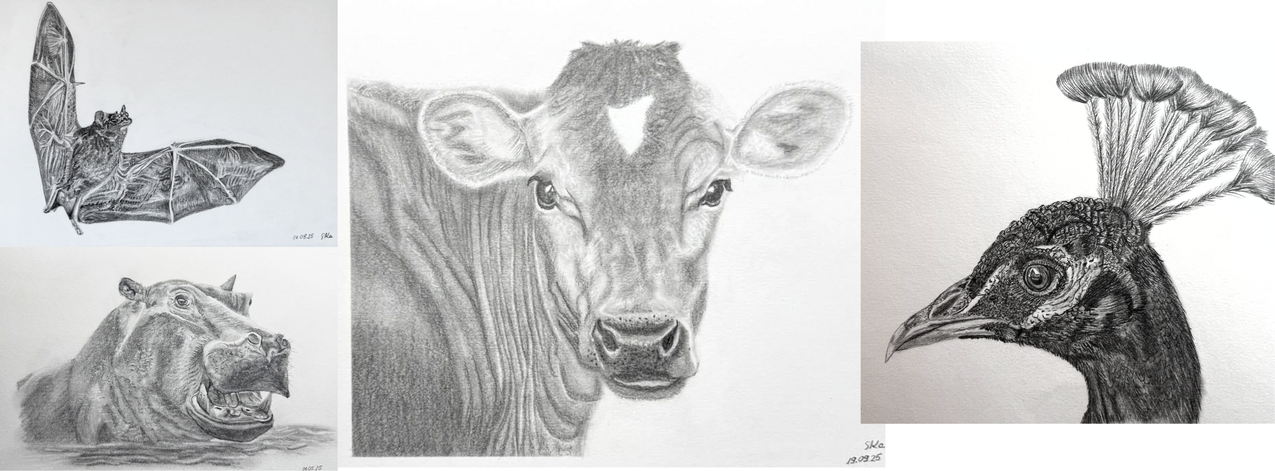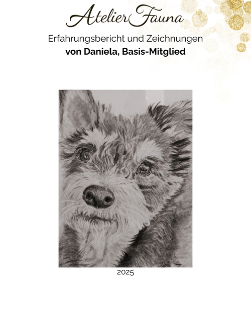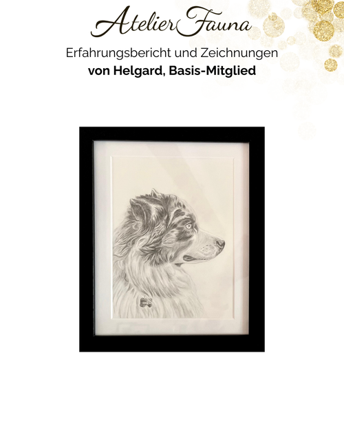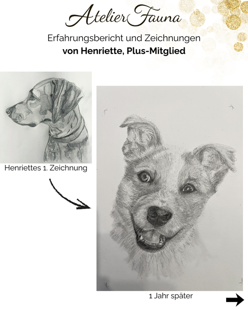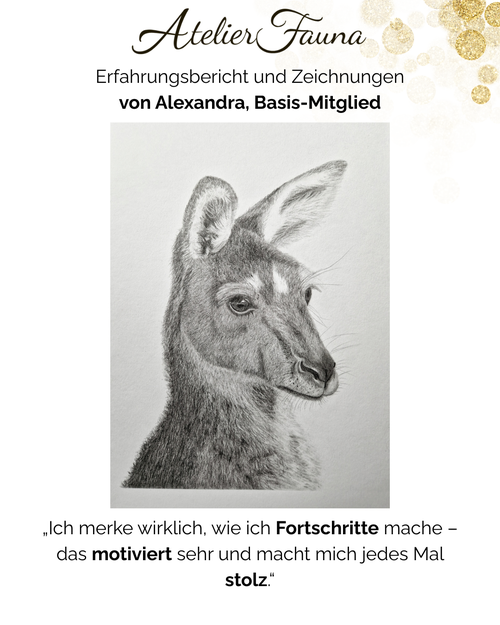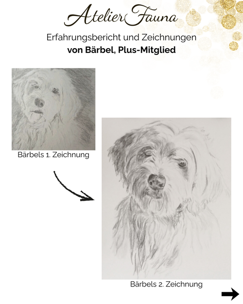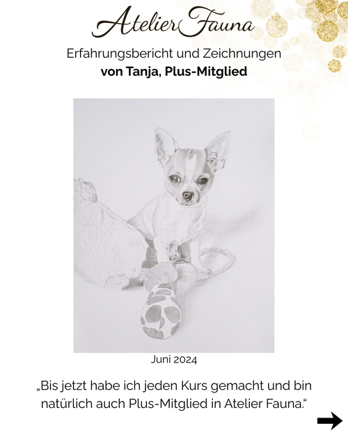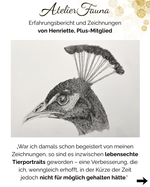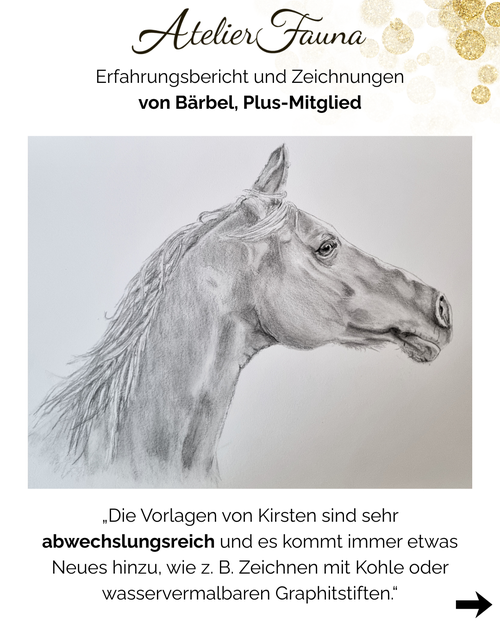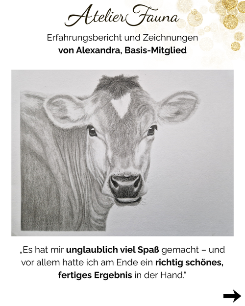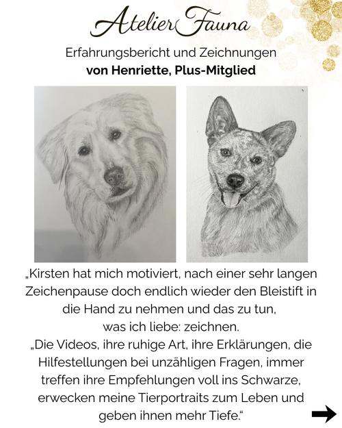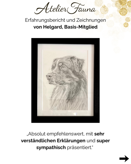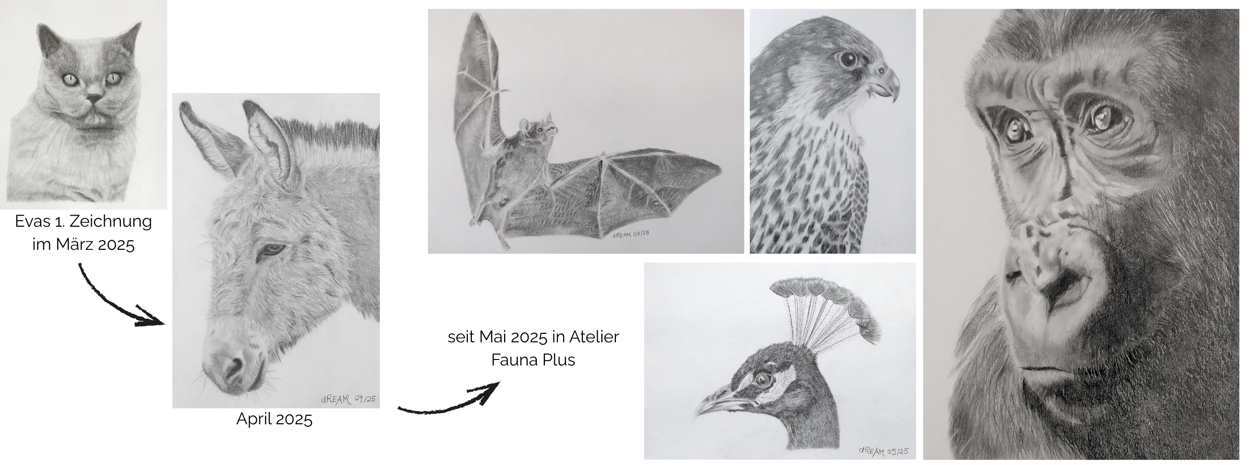 Ich habe schon den allerersten Kurs bei Kirsten im Frühjahr 2024 belegt und habe mir jetzt noch einmal die ersten Zeichnungen von „damals“ angeschaut: War ich damals schon begeistert von meinen Zeichnungen, so sind es inzwischen lebensechte Tierportraits geworden – eine Verbesserung, die ich, wenngleich erhofft, in der Kürze der Zeit jedoch nicht für möglich gehalten hätte.