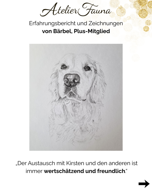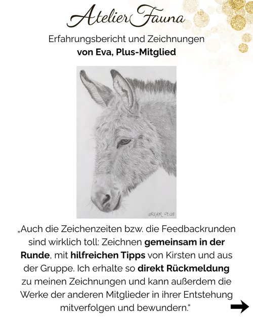 Auch die Zeichenzeiten bzw. die Feedbackrunden sind wirklich toll: Zeichnen gemeinsam in der Runde, mit hilfreichen Tipps von Kirsten und aus der Gruppe. Ich erhalte so direkt Rückmeldung zu meinen Zeichnungen und kann außerdem die Werke der anderen Mitglieder in ihrer Entstehung mitverfolgen und bewundern. Wenn man mal unsicher ist oder einfach den aktuellen Stand seiner Zeichnung zeigen möchte, ist das die perfekte Möglichkeit! Kirsten gibt ganz wertvolle Tipps und auch von den anderen Teilnehmer*innen bekommt man eine Rückmeldung – wenn man das möchte. Mir z. B. passiert es, dass ich, wenn ich schon eine Weile an einem Tierportrait arbeite, den Blick fürs Gesamtbild etwas verliere, da ich ja viele Details ausarbeite. Dann ist es wunderbar, wenn nochmal jemand von außen drauf schaut!