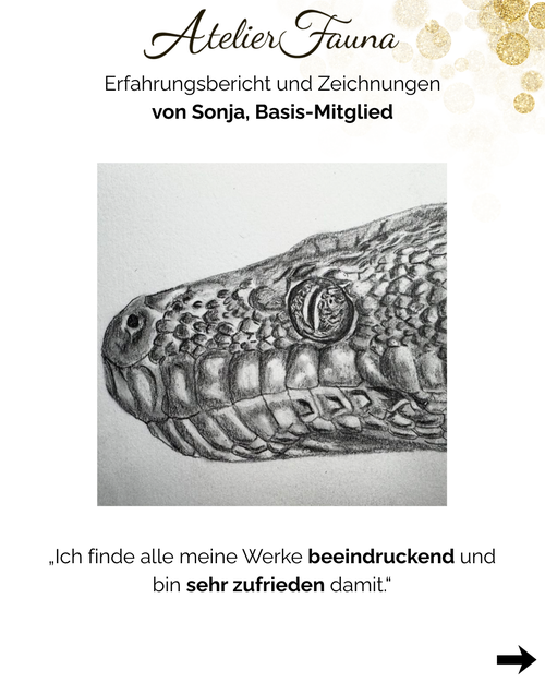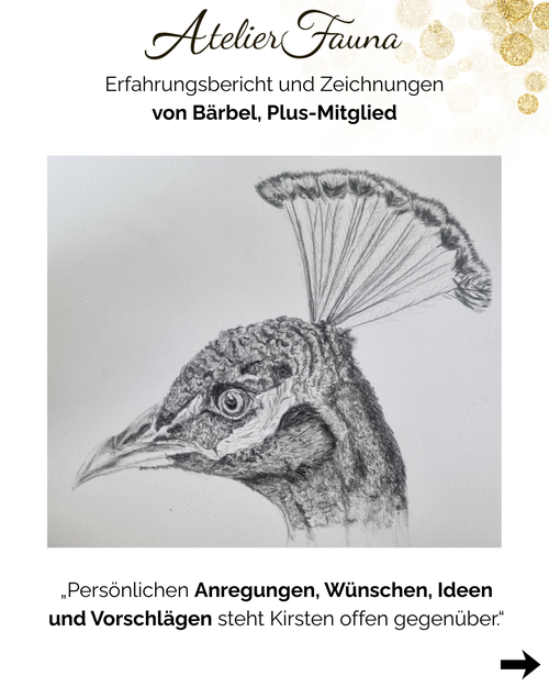 „Ich bin mit dem Grundkurs sehr zufrieden gewesen und jetzt bin ich von Beginn an in Atelier Fauna Plus dabei. Der Austausch mit Kirsten und den anderen ist immer wertschätzend und freundlich. Mittlerweile haben wir uns gut kennengelernt und wir haben in der gemeinsamen Zeichenzeit oft viel zu erzählen und zu lachen.