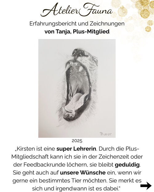 Kirsten ist eine super Lehrerin. Durch die Plus-Mitgliedschaft kann ich sie in der Zeichenzeit oder der Feedbackrunde löchern, sie bleibt geduldig. Sie geht auch auf unsere Wünsche ein, wenn wir gerne ein bestimmtes Tier möchten. Sie merkt es sich und irgendwann ist es dabei.