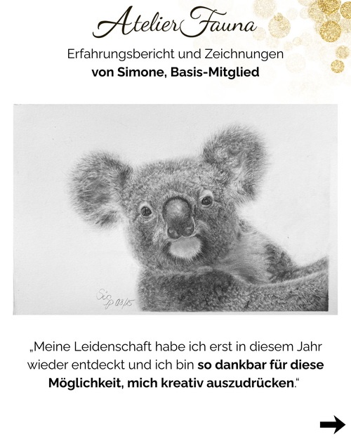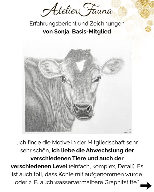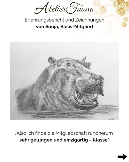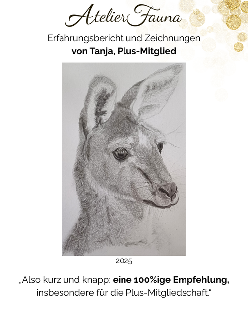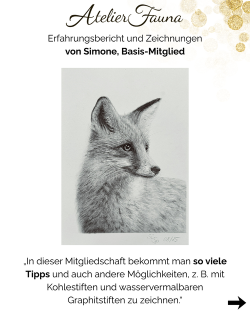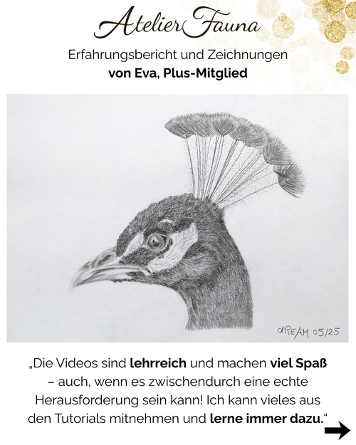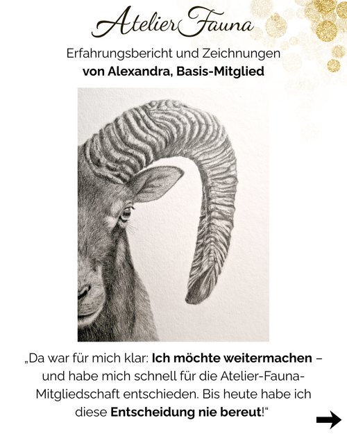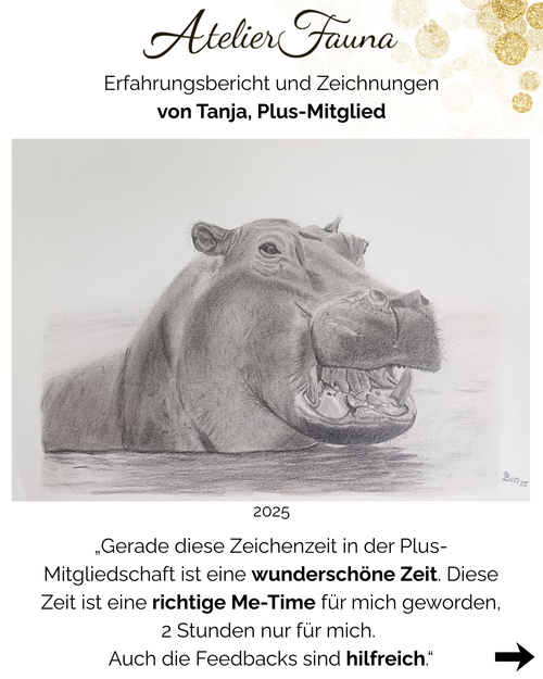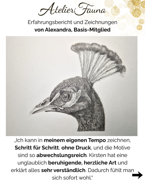 Da war für mich klar: Ich möchte weitermachen – und habe mich schnell für die Atelier-Fauna-Mitgliedschaft entschieden. Bis heute habe ich diese Entscheidung nie bereut! Ich kann in meinem eigenen Tempo zeichnen, Schritt für Schritt, ohne Druck, und die Motive sind so abwechslungsreich.