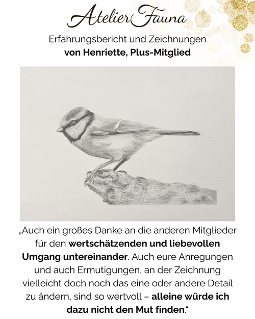 Auch ein großes Danke an die anderen Mitglieder für den wertschätzenden und liebevollen Umgang untereinander. Auch eure Anregungen und auch Ermutigungen, an der Zeichnung vielleicht doch noch das eine oder andere Detail zu ändern, sind so wertvoll – alleine würde ich dazu nicht den Mut finden. Die gemeinsamen Zeichenzeiten sind immer ein fester Termin in meinem Kalender.“