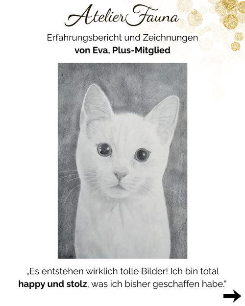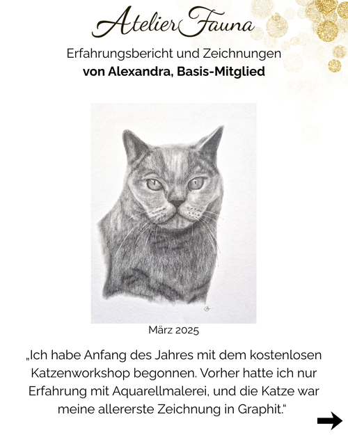 „Ich habe Anfang des Jahres mit dem kostenlosen Katzenworkshop begonnen. Vorher hatte ich nur Erfahrung mit Aquarellmalerei, und die Katze war meine allererste Zeichnung in Graphit. Es hat mir unglaublich viel Spaß gemacht – und vor allem hatte ich am Ende ein richtig schönes, fertiges Ergebnis in der Hand.
