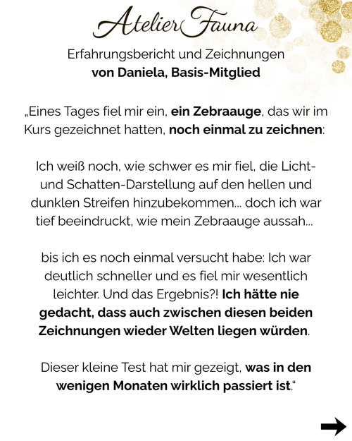 Eines Tages fiel mir ein, ein Zebraauge, das wir im Kurs gezeichnet hatten, noch einmal zu zeichnen: Ich weiß noch, wie schwer es mir fiel, die Licht- und Schatten-Darstellung auf den hellen und dunklen Streifen hinzubekommen... doch ich war tief beeindruckt, wie mein Zebraauge aussah... bis ich es noch einmal versucht habe: Ich war deutlich schneller und es fiel mir wesentlich leichter. Und das Ergebnis?! Ich hätte nie gedacht, dass auch zwischen diesen beiden Zeichnungen wieder Welten liegen würden. Dieser kleine Test hat mir gezeigt, was in den wenigen Monaten wirklich passiert ist.