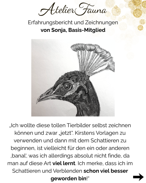 Was mich bewogen hat: Ich wollte diese tollen Tierbilder selbst zeichnen können und zwar „jetzt“. Ich bin parallel in einem Kurs, in dem man von Anfang an alle Basics lernt und irgendwann auch mal in der Lage sein wird, selbst tolle Bilder zu zeichnen. Das heißt allerdings gaaaaanz viele Basics... Ich finde das sinnvoll und wichtig, aber wenn ich nur auf dieser Ebene lerne und mich weiterentwickele, ist es mir zu öde. Kirstens Vorlagen zu verwenden und dann mit dem Schattieren zu beginnen, ist vielleicht für den ein oder anderen ‚banal‘, was ich allerdings absolut nicht finde, da man auf diese Art viel lernt. Ich merke, dass ich im Schattieren und Verblenden schon viel besser geworden bin!