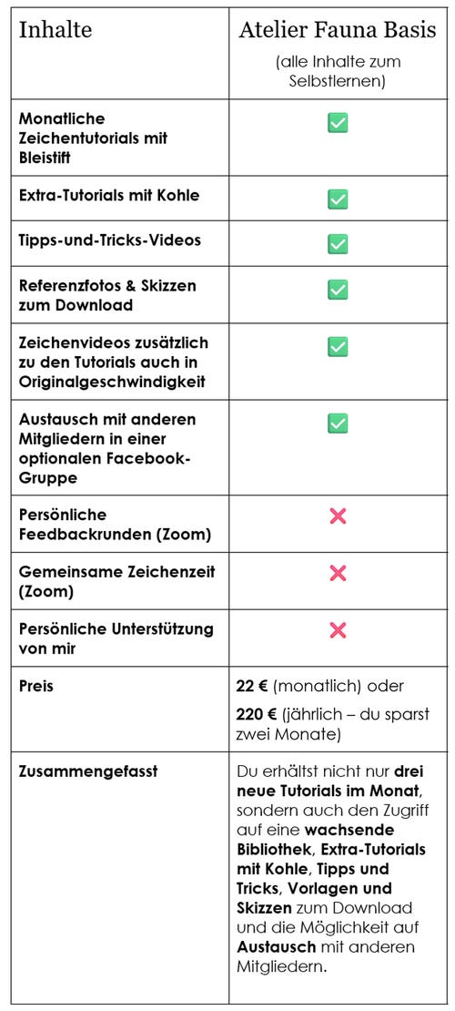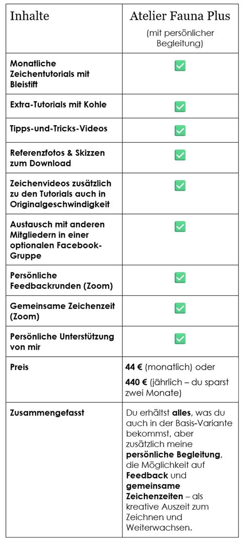 Du erhältst gleich nach dem Bezahlvorgang Zugriff auf die Inhalte von Atelier Fauna auf meiner Kursplattform. Die monatlichen Inhalte werden jeweils am 1. jedes Monats freigeschaltet. Die Termine der Feedbackrunden und Zeichenzeiten werden frühzeitig mitgeteilt.