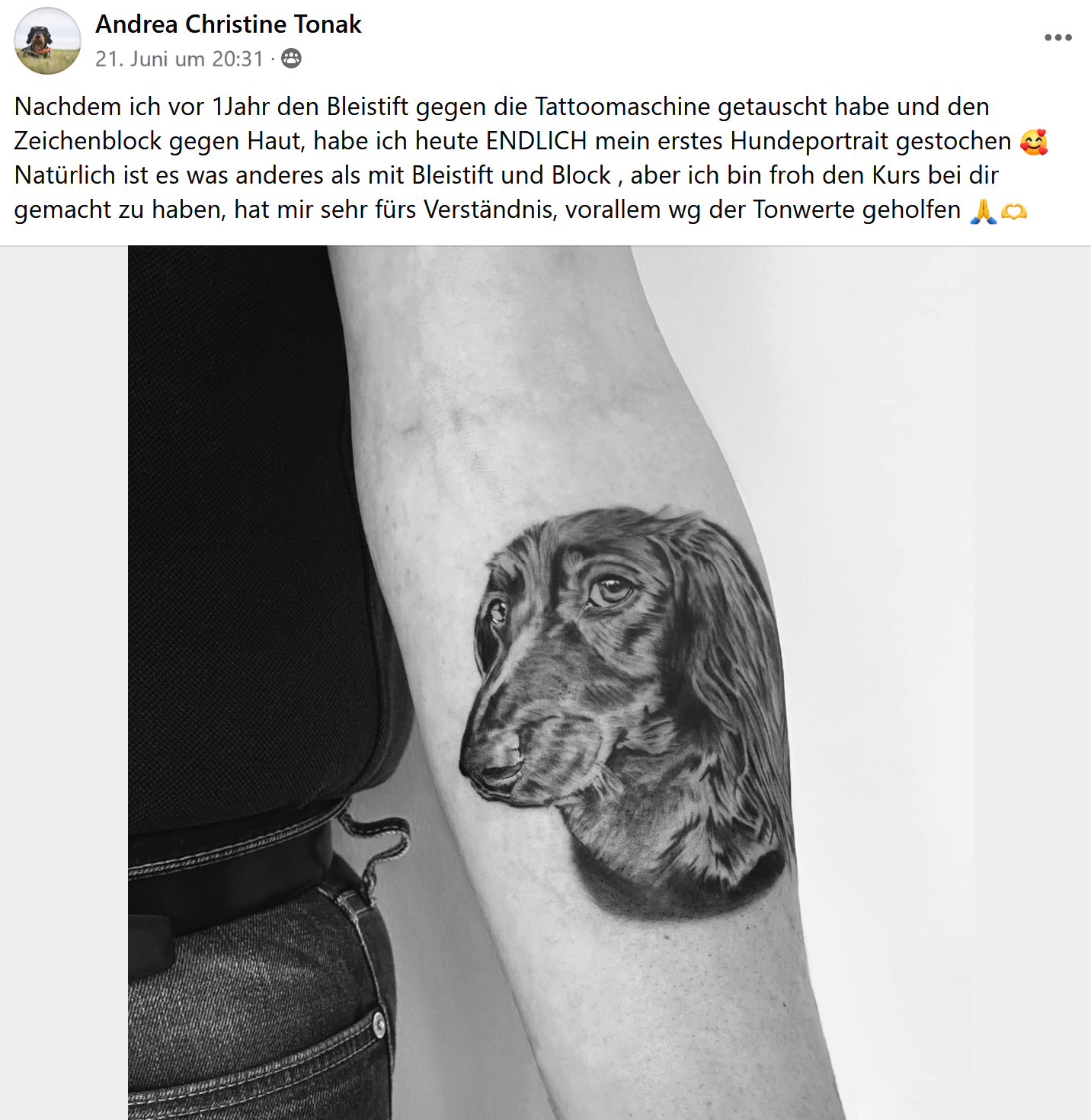 „Ich hätte mich ohne den Kurs sicherlich nicht getraut, unsere Hündin zu porträtieren und ich bin total stolz auf mein Ergebnis. Ich werde sicher auch in Zukunft dabeibleiben, Tierporträts auf Grundlage dieses Zeichenkurses anzufertigen und bin wirklich froh, auf das Kursangebot von Kirsten gestoßen zu sein. Ich glaube, es ist nicht selbstverständlich, in nur vier Wochen das eigene Zeichnen so verbessern zu können. Toll war auch, dass man für seine Zeichnungen immer viel Zuspruch, aber auch konstruktive Hinweise bekommen hat, die sehr hilfreich waren. Ich kann diesen Kurs nur empfehlen.“