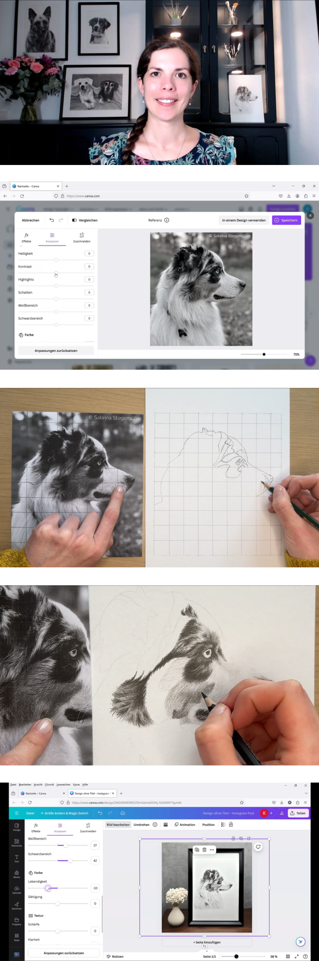 „Ich habe mich sehr gespannt und neugierig, was in dem Kurs gemacht wird, angemeldet. Dass ich aber selber so schöne Tierportraits zeichnen werde, hatte ich nicht erwartet. Aber da hab ich mich echt geirrt, es gab so tolle und detaillierte Erklärungen, alles auch in Videos gezeigt und erklärt, dass es so viel Spaß und Freude gemacht hat, zu sehen was ich aufs Papier bringen kann. Ich bin mit meinen Bildern sehr happy und auch beeindruckt.“